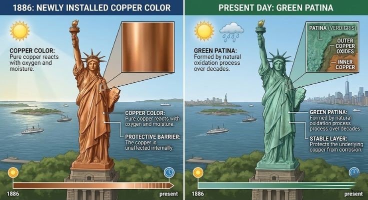 Over time, copper reacts with oxygen, water, and air pollutants to form a compound called copper carbonate, or patina. This chemical process is called oxidation. It took about 20 to 30 years for the statue to fully turn the blue-green color we recognize today. The change happened gradually, and there were actually proposals at the time to paint the statue to restore its original color.